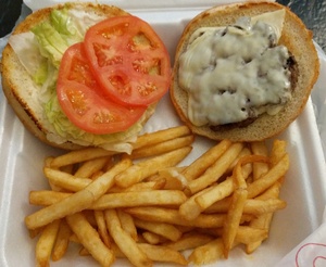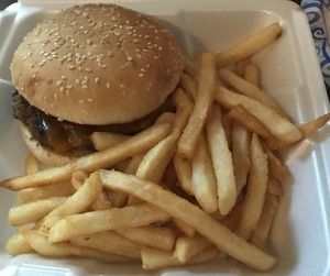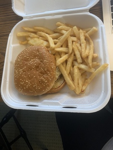 Hand pressed Black Angus patties. Served with a pickle wedge and french fries